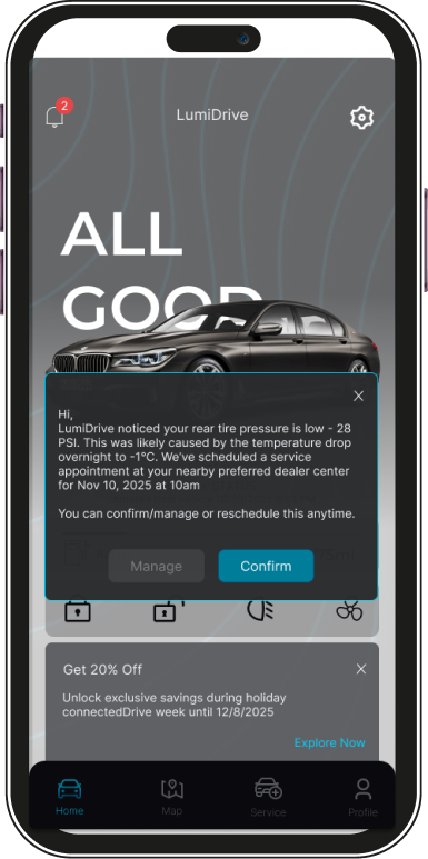 Continuous support beyond the drive: Push notifications enable drivers to review, manage, or reschedule services appointments. when they are relaxed, free from driving distractions.